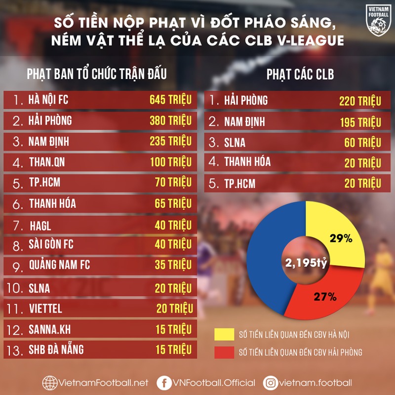 Đáng chú ý trong số này, BTC sân Hàng Đẫy bị phạt nhiều nhất khi số tiền lên tới 645 triệu đồng, xếp sau lần lượt là Hải Phòng với 380 triệu đồng và Nam định 235 triệu đồng. Tuy nhiên nếu nhìn vào số liệu này, chắc hẳn nhiều người sẽ nghĩ rằng CLB Hà Nội là đội bóng để CĐV của mình chơi pháo sáng nhiều nhất trên sân nên mới bị phạt số tiền cao kỉ lục đến vậy.