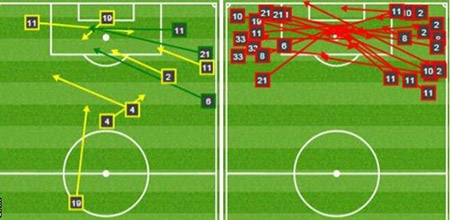 Trong trận đấu gần nhất, Southampton thực hiện 33 đường căng ngang nhưng chỉ có năm lần bóng tới được cầu thủ trong vòng 16m50 (mũi tên xanh và vàng ở ảnh trái). Leicester là đội chịu nhiều đường tạt bóng nhất mùa này với 341 lần, nhưng chỉ 61 trong đó có cầu thủ đối phương chạm được trong vòng 16m50. Ảnh: Opta. |