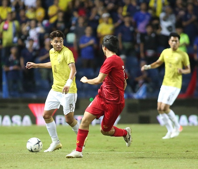 ĐT Việt Nam là đội kiểm soát bóng trong hiệp 1, nhưng các cơ hội ngon ăn đều thuộc về ĐT Thái Lan. Phút 18, Supachai Jaided có pha đỡ bóng bằng ngực và xoay người dứt điểm đẳng cấp, đưa bóng đi trúng vào cột dọc khung thành của Văn Lâm. Phút 33, Trọng Hoàng phá bóng không dứt khoát tạo điều kiện để Thitipan Puangchan bắt vô lê đưa bóng đi chệch khung thành ĐT Việt Nam trong gang tấc.