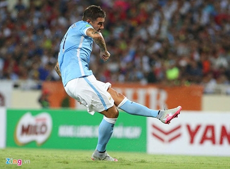 Sau đường chuyền nỗ lực của Chí Công, Văn Quyết tỳ đè khéo léo trước sự đeo bám của hậu vệ Man City trước khi tâng bóng kỹ thuật qua đầu thủ môn Caballero.