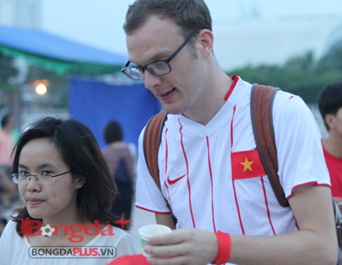 19h07: Anh chàng Gerben người Hà Lan rất thích các CLB ở châu Âu. Cầu thủ Man City anh yêu thích là Kompany và Navas. Nhưng hôm nay anh mặc áo Việt Nam và cổ vũ đội bóng của HLV Miura vì lý do người yêu anh là người bản xứ.