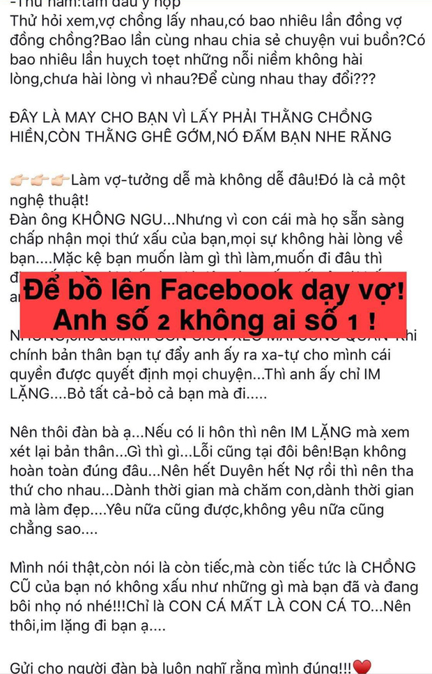 "10 năm qua đối với anh tính bằng những bản hợp đồng chuyển nhượng! Còn đối với em, thì là 10 năm làm vợ, làm mẹ không lương. 10 năm qua em sống - lấy anh và các con làm động lực, lùi lại phía sau để anh hết lòng phấn đấu vì sự nghiệp. 10 năm vò võ 1 mình ôm 2 con thơ, không biết bao đêm nước mắt chảy dài, trong lòng tự hỏi đến bao giờ mới có ngày chồng mình ở nhà, cùng mình chăm lo gia đình, con cái. 10 năm em lặng lẽ đứng sau anh, liệu đã bao giờ anh tự hỏi “Vợ mình hôm nay có vui không?” “Vợ mình liệu có hạnh phúc không?”, hay chỉ là những buổi chiều mệt mỏi, em vừa nấu ăn vừa khóc, nhưng anh đi về chỉ lạnh lùng hỏi “ Sao giờ này chưa có cơm ăn?