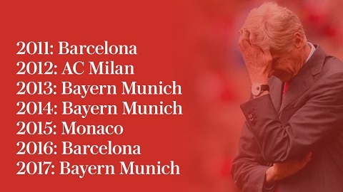 Trong 6 mùa giải qua, Arsenal luôn kết thúc ở vị trí nhì bảng. Việc họ gặp những đội bóng mạnh và xếp đầu bảng như là một điều không thể tránh. Họ gặp Bayer Munich 2 lần, Barcelona 2 lần, AC Milan và Monaco một lần. Tất cả đều có chung kết quả: Arsenal dừng bước.