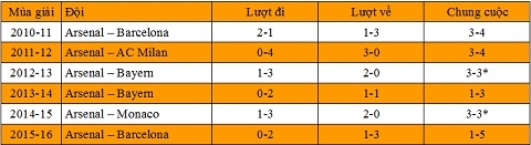 Thành tích của Arsenal tại vòng 16 đội trong 6 mùa giải gần nhất |