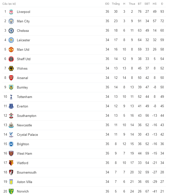 Với những kết quả như vậy, Man City đã chắc chắn kết thúc mùa giải ở vị trí nhì bảng. Trong khi đó, Chelsea tuy hiện tại vẫn nằm trong Top 4 song nếu Leicester có điểm trước Bournemouth và MU đánh bại Southampton ở những trận đấu sau đó của vòng 35 thì The Blues sẽ chắc chắn rơi khỏi nhóm được dự Champions League.
