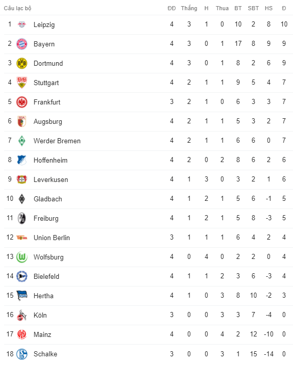 Với kết quả như vậy, Bayern Munich và Dortmund cùng có 9 điểm, nhưng Bayern xếp trên nhờ hơn hiệu số. Hai đội còn kém đội đầu bảng RB Leipzig duy nhất 1 điểm.