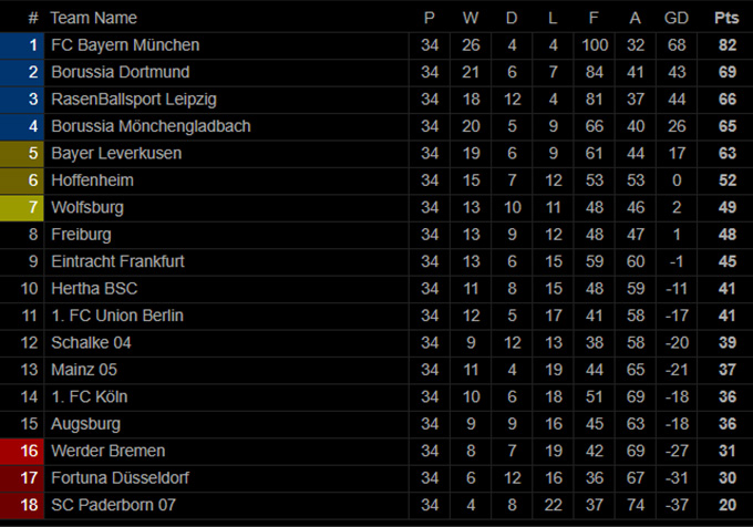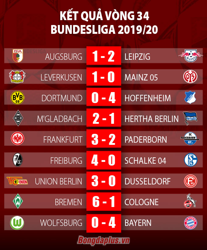 Ở các suất dự cúp châu Âu mùa tới, Bayern, Dortmund, Leipzig và M'Gladbach sẽ là 4 đội đại diện cho Bundesliga chinh chiến ở Champions League. Trong khi đó, Leverkusen sẽ tham dự vòng bảng Europa League, còn Hoffenheim cùng Wolfsburg tranh tài ở vòng sơ loại.