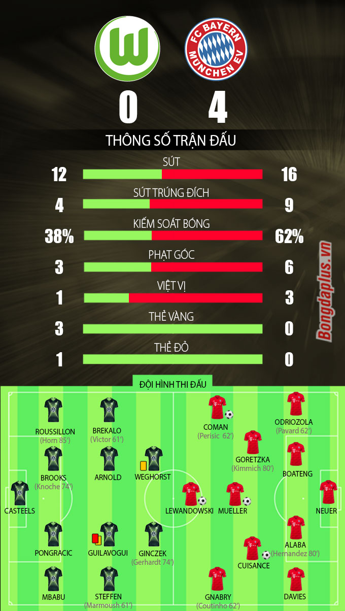 Đến phút 37, cách biệt đã được nhân đôi cho Bayern với pha lập công của tiền vệ 20 tuổi Mickael Cuisance. Nắm lợi thế khá an toàn, đoàn quân của HLV Hansi Flick thi đấu như dạo chơi trong hiệp 2 song vẫn tạo ra được nhiều sóng gió về cầu môn Wolfsburg.