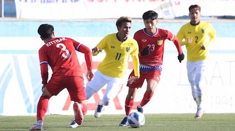 Ở trận đấu mở màn của bảng J, U23 Thái Lan đã bất ngờ bị U23 Mông Cổ cầm hoà với tỷ số 1-1. Vì thế, ở trận đấu thứ 2 gặp U23 Lào, đội bóng trẻ xứ Chùa vàng đã bằng mọi giá phải giành chiến thắng, hòng có thể nuôi hy vọng giành vé có mặt vào vòng chung kết. Trước một đối thủ yếu như U23 Lào, U23 Thái Lan chơi lấn lướt ngay từ đầu và có nhiều cơ hội để mở tỷ số. Nhưng cũng phải đến phút 39, U23 Thái Lan được hưởng quả phạt đền. Đội trưởng Thanawat đã mở tỷ số 1-0 cho đội nhà trên chấm 11m.