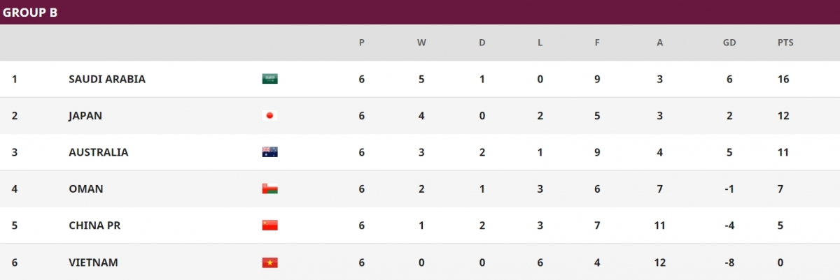 ĐT Nhật Bản giành chiến thắng 1-0 trong chuyến làm khách ĐT Oman còn ĐT Australia bị ĐT Trung Quốc cầm hoà 1-1 trên sân trung lập đã khiến ngôi nhì bảng B vòng loại thứ ba World Cup 2022 khu vực châu Á đổi chủ.
