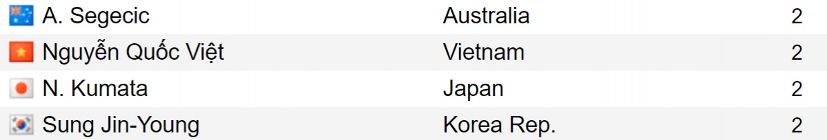 Trong số này, có 4 cầu thủ ghi được 2 bàn thắng gồm: Adrian Segecic (Australia), Naoki Kumata (Nhật Bản), Sung Jin Young (Hàn Quốc) và Nguyễn Quốc Việt (Việt Nam).