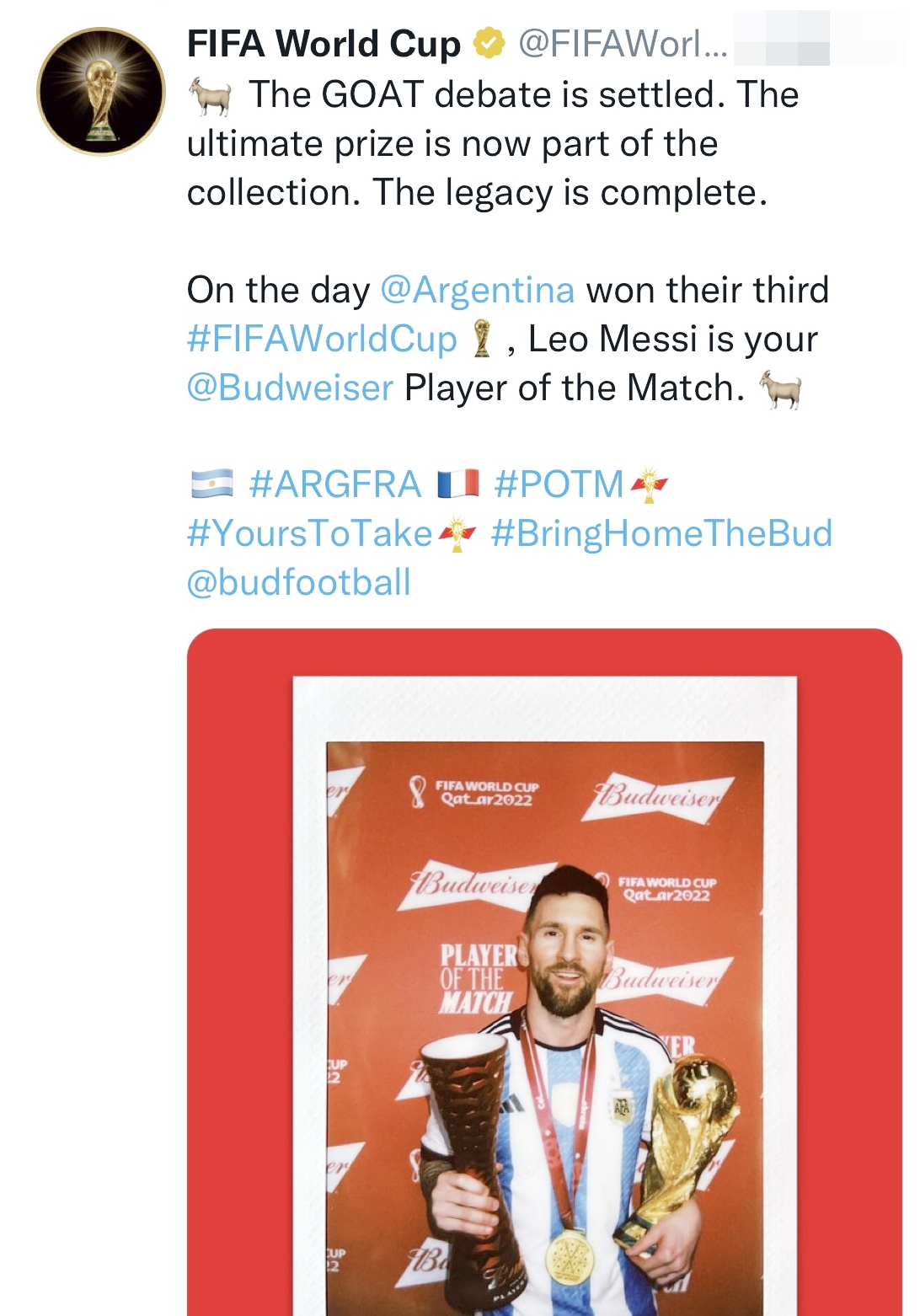 GOAT là Greatest of All Time, có nghĩa cầu thủ hay nhất mọi thời đại. "Cuộc tranh luận về GOAT đã được giải quyết. Giải thưởng lớn nhất (Cúp vàng thế giới) đã trở thành một phần trong bộ sưu tập của cầu thủ vĩ đại. Di sản hoàn tất", tài khoản của FIFA trên Tweet đăng tải kèm ảnh Messi cầm Cúp vàng và danh hiệu Cầu thủ hay nhất trận chung kết".