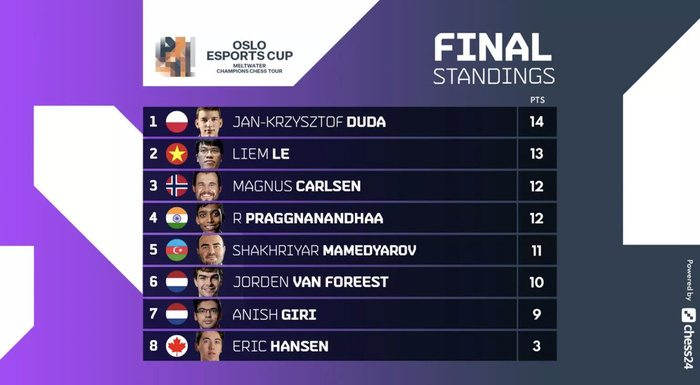 Trong khi đó, nhà đương kim vô địch World Cup Jan-Krzysztof Duda đã tận dụng cơ hội tốt hơn kỳ thủ số 1 Việt Nam để giành ngôi vô địch, khi anh thắng 2,5-0,5 trước Eric Hansen mà không cần đến tie-break như Quang Liêm.