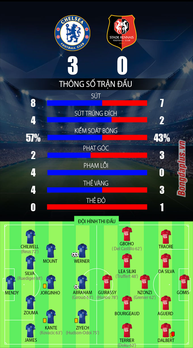 Trên chấm penalty, Werner tiếp tục không mắc sai lầm nào để hoàn tất cú đúp. Phải chơi thiếu người trước một Chelsea hưng phấn, Rennes không thể gượng dậy nên việc họ nhận thêm bàn thua cũng là điều dễ hiểu. Phút 50, nhận đường kiến tạo của hậu vệ Reece James, Abraham dứt điểm quyết đoán nâng tỷ số lên 3-0. Ở quãng thời gian còn lại, The Blues chơi thong dong song vẫn tạo ra được sức ép lớn về phía cầu môn đội khách. Dù vậy, không có thêm bàn nào được ghi. Chung cuộc, Chelsea hạ Rennes 3-0. Ở cặp đấu còn lại của bảng E Champions League, Sevilla đã đánh bại Krasnodar 3-2 để có cùng 7 điểm với Chelsea sau 3 lượt trận. Tuy nhiên, The Blues vẫn dẫn đầu bảng do trội hơn về chỉ số phụ.