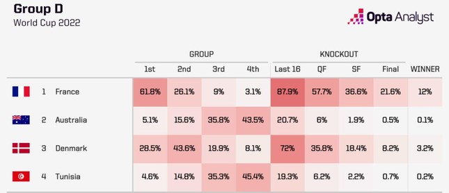 Tại Nations League cách đây không lâu, Pháp thể hiện phong độ kém cỏi với chỉ 1 chiến thắng sau 6 trận. Lá thăm may rủi đưa họ vào cùng bảng với Đan Mạch - đội bóng 2 lần đánh bại họ ở vòng bảng Nations League vừa qua. Theo số liệu của Opta, đội tuyển Pháp có đến 61,8% sẽ đứng đầu bảng D, World Cup 2022. Nhưng với những gì Đan Mạch đã thể hiện, Les Blues vẫn có nguy cơ xếp thứ 2 và hoàn toàn có thể gặp Argentina (bảng C) ở vòng 16 đội.