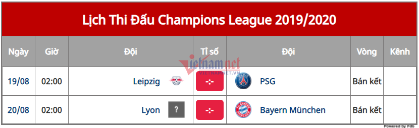 Như vậy 2 cặp bán kết Champions League năm nay được xác định là những màn so tài giữa hai nền bóng đá Pháp và Đức: PSG vs RB Leipzig và Bayern Munich vs Lyon.