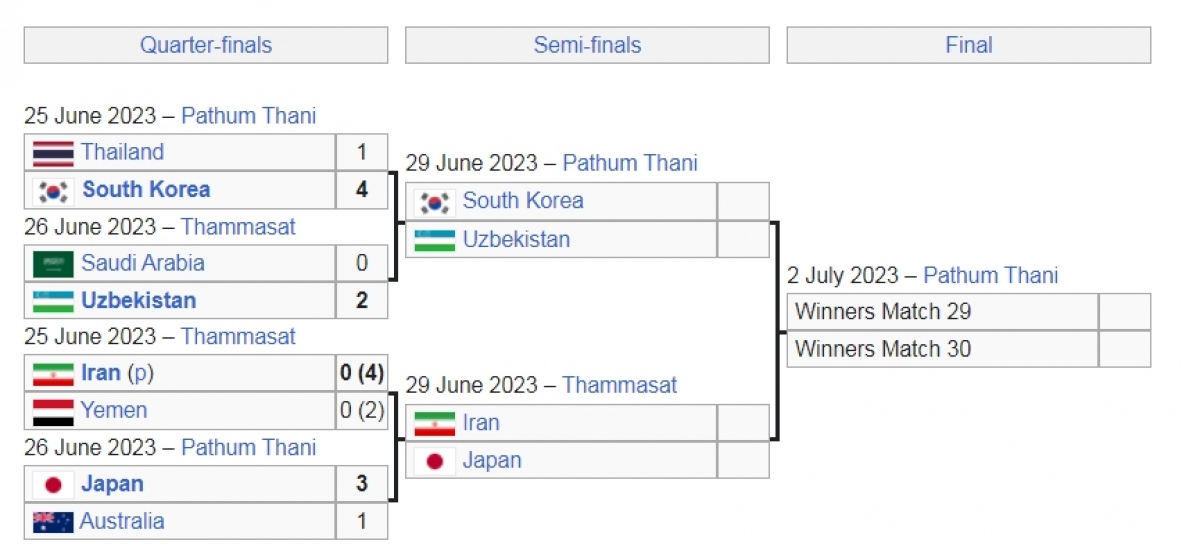 Ở vòng bán kết, U17 Hàn Quốc sẽ gặp U17 Uzbekistan, trong khi U17 Nhật Bản sẽ so tài với U17 Iran. Các trận bán kết giải U17 châu Á 2023 diễn ra vào ngày 29/6 tới.