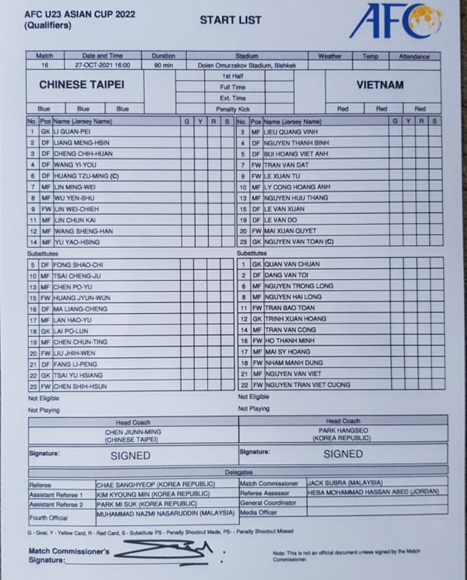 Đội hình ra sân U23 Việt Nam vs U23 Đài Loan