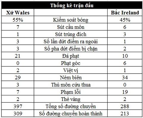 Xứ Wales mở tỷ số trong pha bóng có phần nhiều may mắn, nhưng nó là sự cụ thể hóa lợi thế trên bảng điện tử nhờ vào chất lượng vượt trội của 1 cá nhân (Bale). Bảo vệ lợi thế dẫn trước ở cuối trận không có gì quá khó khăn với Xứ Wales, bởi Bắc Ireland đã rất đuối sức sau thời gian dài phải căng sức ra chống đỡ trong cả hiệp 2. Trong lần đầu tiên dự vòng tứ kết EURO, vào ngày 1/7 tới Xứ Wales sẽ gặp đội thắng trong trận Bỉ - Hungary đêm nay.