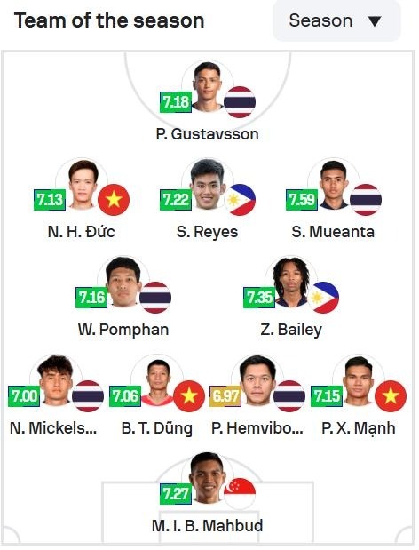 Ngoài ra, tuyển Việt Nam dù là nhà đương kim vô địch nhưng chỉ có 3 cái tên xuất hiện trong đội hình xuất sắc nhất theo Sofascore, gồm Xuân Mạnh, Tiến Dũng và Hoàng Đức.