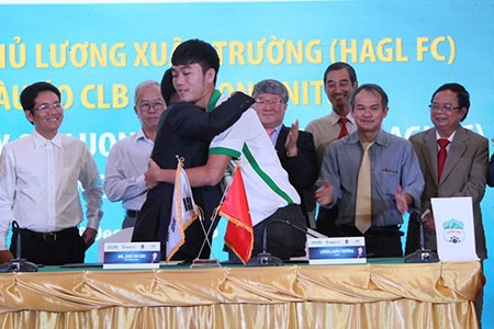 Bầu Đức trong lễ ký kết hợp đồng chuyển nhượng Xuân Trường sang Hàn Quốc - Ảnh: Khả Hòa |
