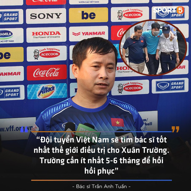 Bác sĩ Trần Anh Tuấn nói: "Sáng nay (1/10), chúng tôi đưa Trường đi kiểm tra và xác định cậu ấy bị đứt dây chằng chéo trước. Trường hợp này được chỉ định phẫu thuật, tái tạo lại dây chằng. Chúng tôi cũng đã báo cáo với VFF, Ban Y học để tìm bệnh viện tốt nhất trên thế giới cho Xuân Trường điều trị".