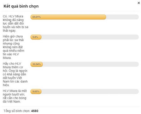 Sau trận thua Thái Lan 0-3, uy tín của HLV Miura giảm xuống khá nhiều. Cụ thể trong một cuộc điều tra gần nhất, có tới 69,61% người hâm mộ muốn VFF nhanh chóng sa thải chiến lược người Nhật.