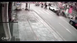Camera ghi lại cảnh xe máy lạng lách, phanh gấp, trượt ngã vào gầm ô tô, bất tỉnh trên đường ở Hà Nội