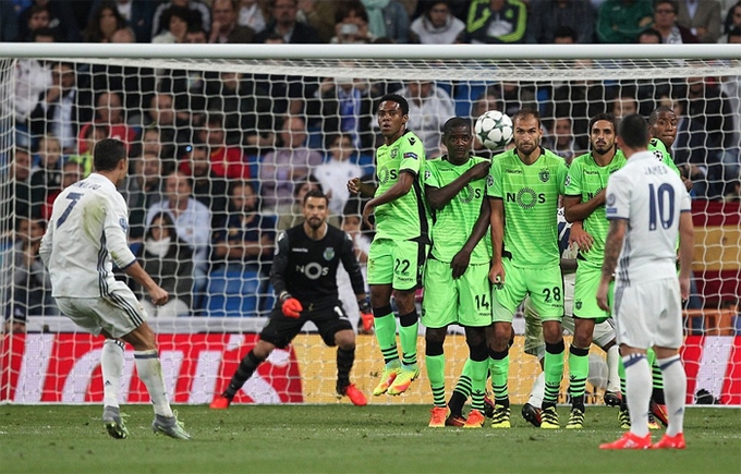 9. Cú sút phạt của Ronaldo trong trận Real thắng Sporting 2-1. Vòng bảng ngày 14/9/2016.