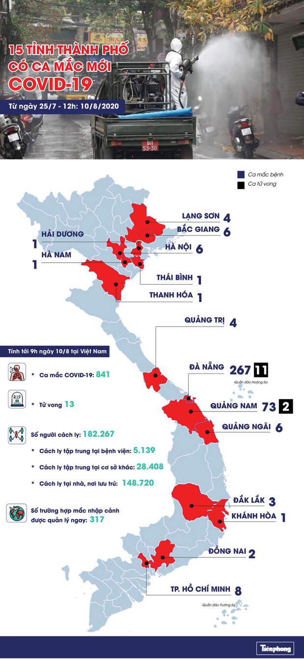 Từ ngày 25/7 đến 9h ngày 10/8/2020, Việt Nam có 384 ca mắc COVID-19 mới, 13 trường hợp tử vong tại 15 tỉnh, thành phố có liên quan đến Đà Nẵng.