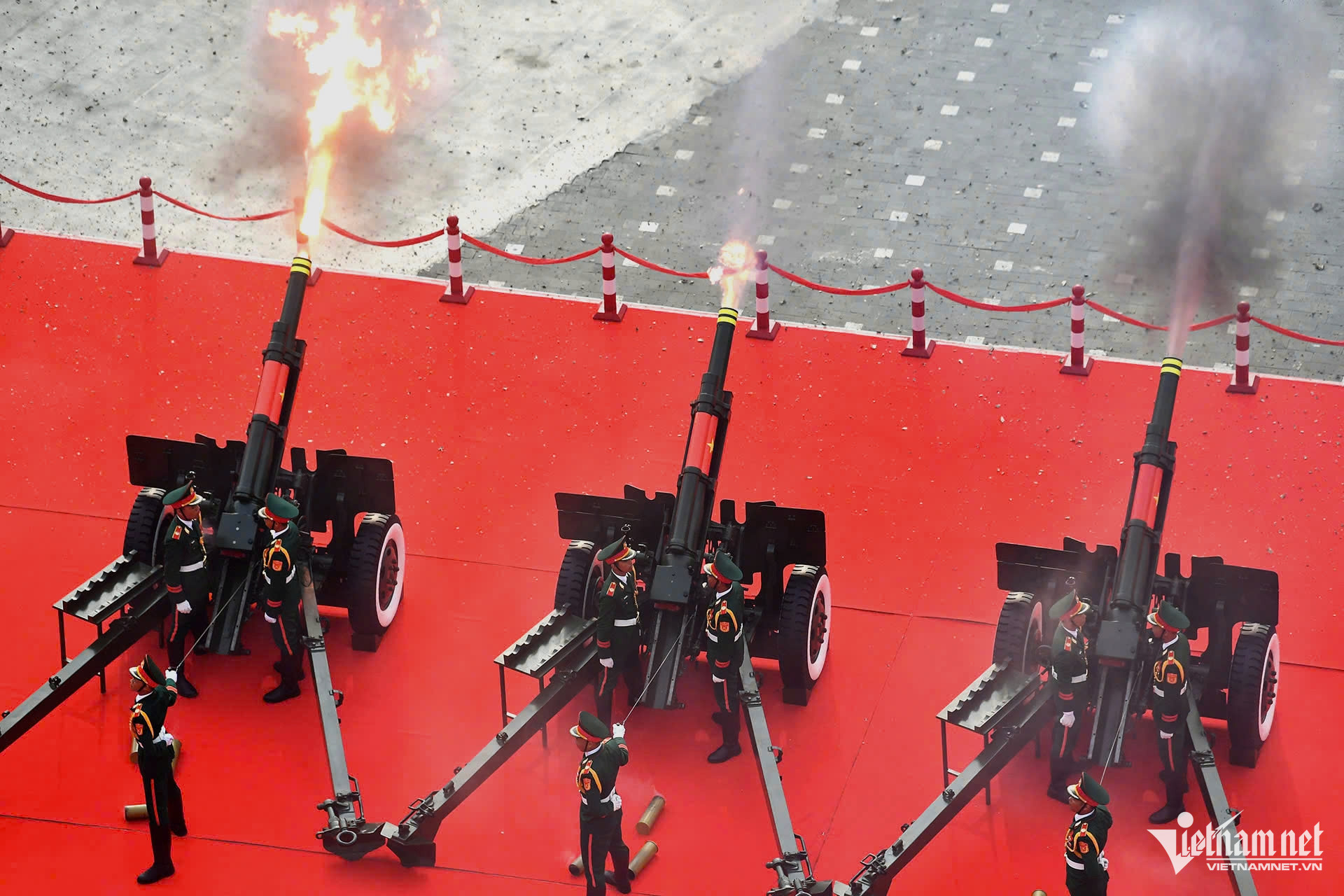 “Nghiêm, Chào cờ, Chào!”, sau tiếng hô, Quốc ca được vang lên. Cùng thời khắc thiêng liêng này, đội pháo lễ (tại bến Bến Bạch Đằng) đồng loạt bắn 21 phát đại bác vang rền trên nền Quốc ca chào mừng kỷ niệm 50 năm thống nhất đất nước 30/4/1975 - 30/4/2025.