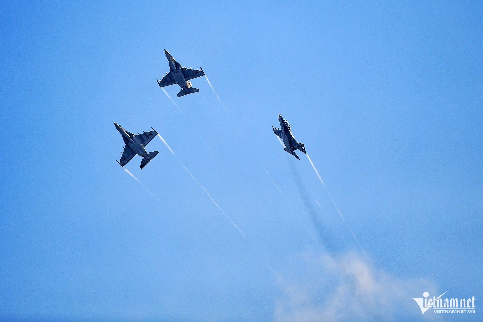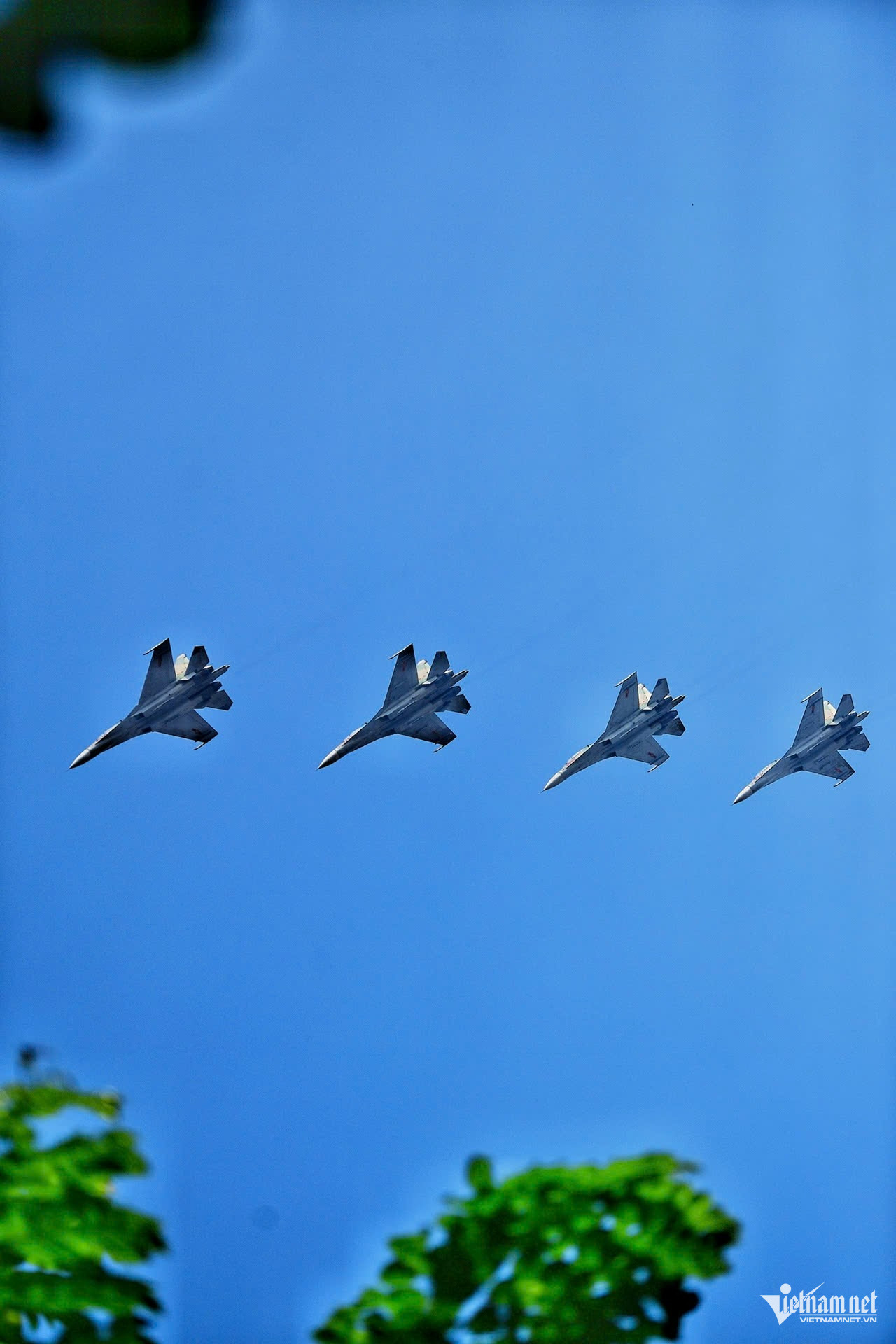 Cùng lúc đó, đội hình 10 trực thăng được chia thành 3 biên đội, theo đội hình 3-4-3, giữ khoảng cách đảm bảo an toàn và tính đồng bộ.