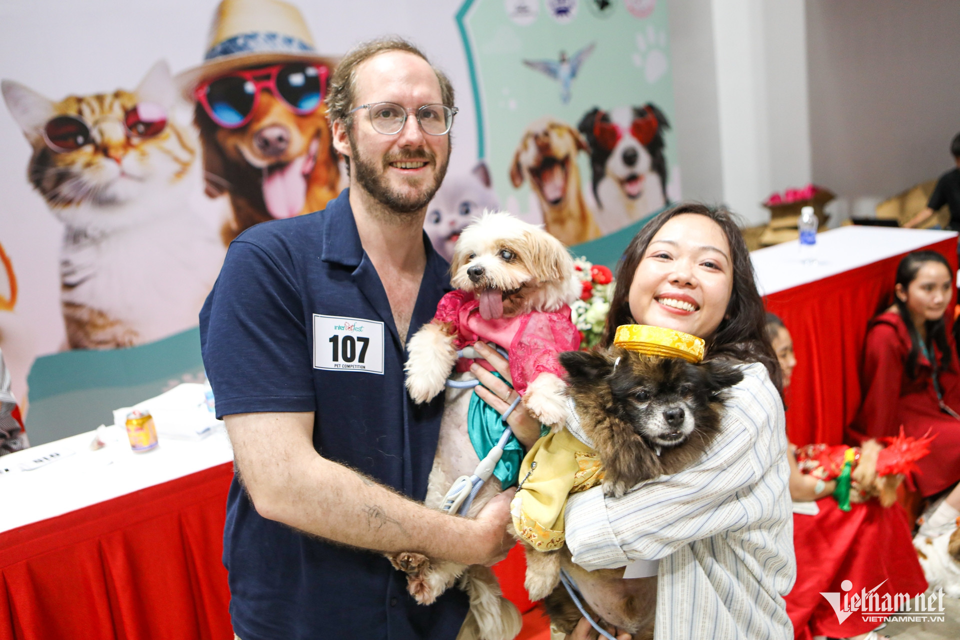 Trong ảnh, chị Phương Anh (quận Bình Thạnh) cùng ông xã người Mỹ mang 2 bé cún đã gắn bó với gia đình hơn 10 năm tham gia cuộc thi thời trang.