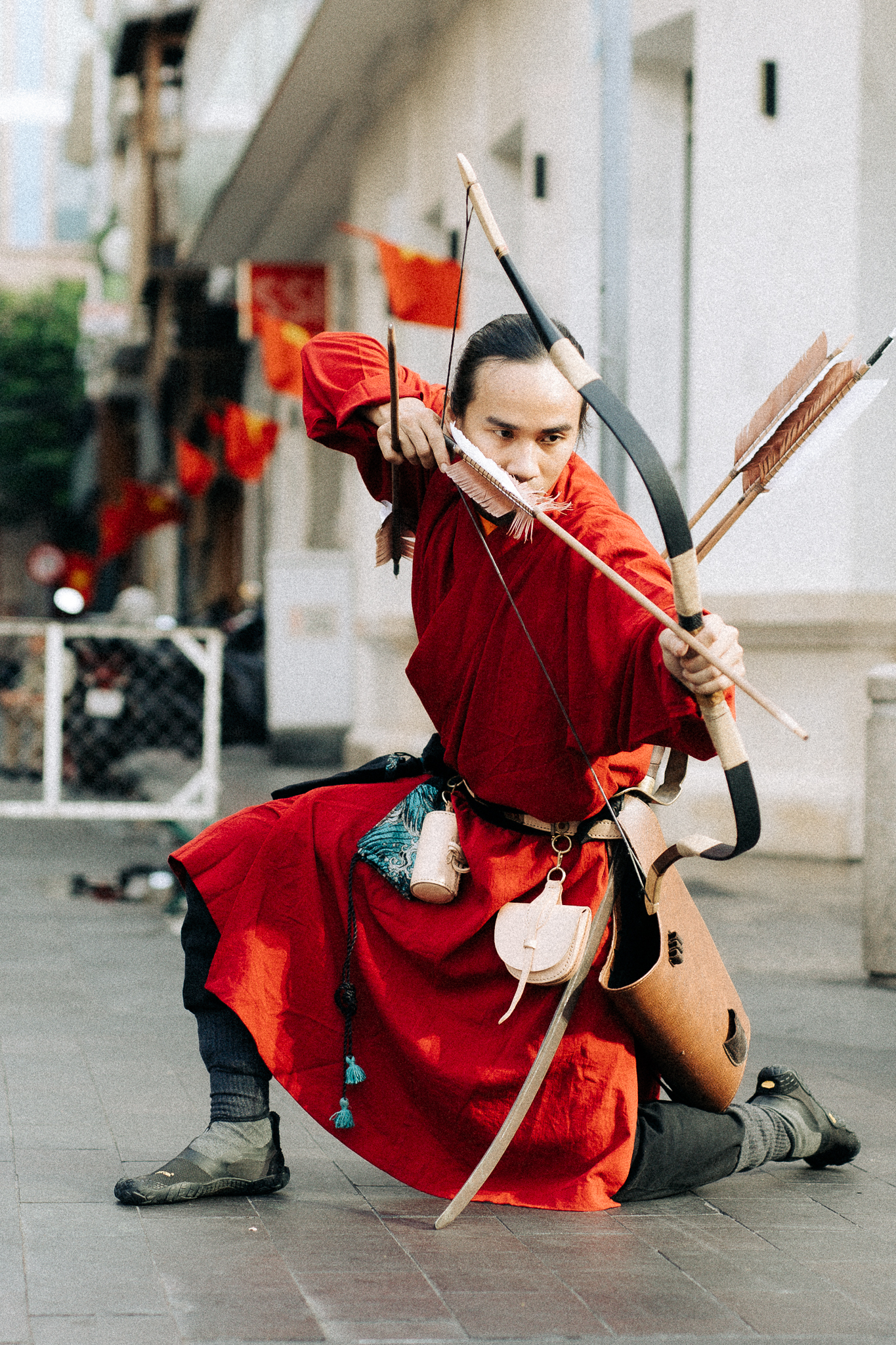 Đi cùng các bộ trang phục là nhiều phụ kiện tinh tế như quạt, nón ba tầm, nón lá, cho đến các loại binh khí như cung tên, kiếm, tạo nên điểm nhấn đặc sắc.