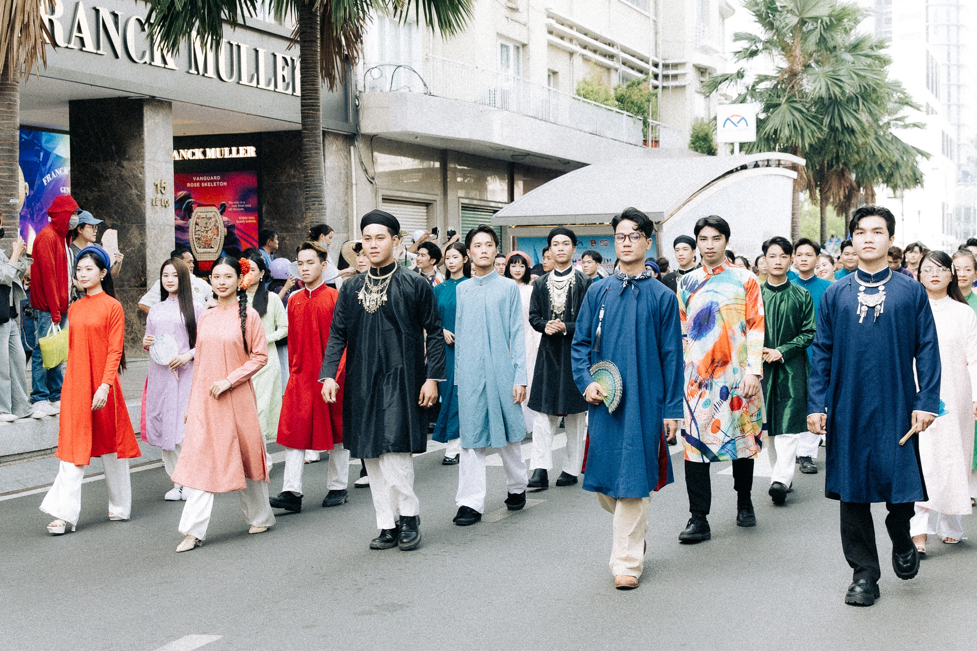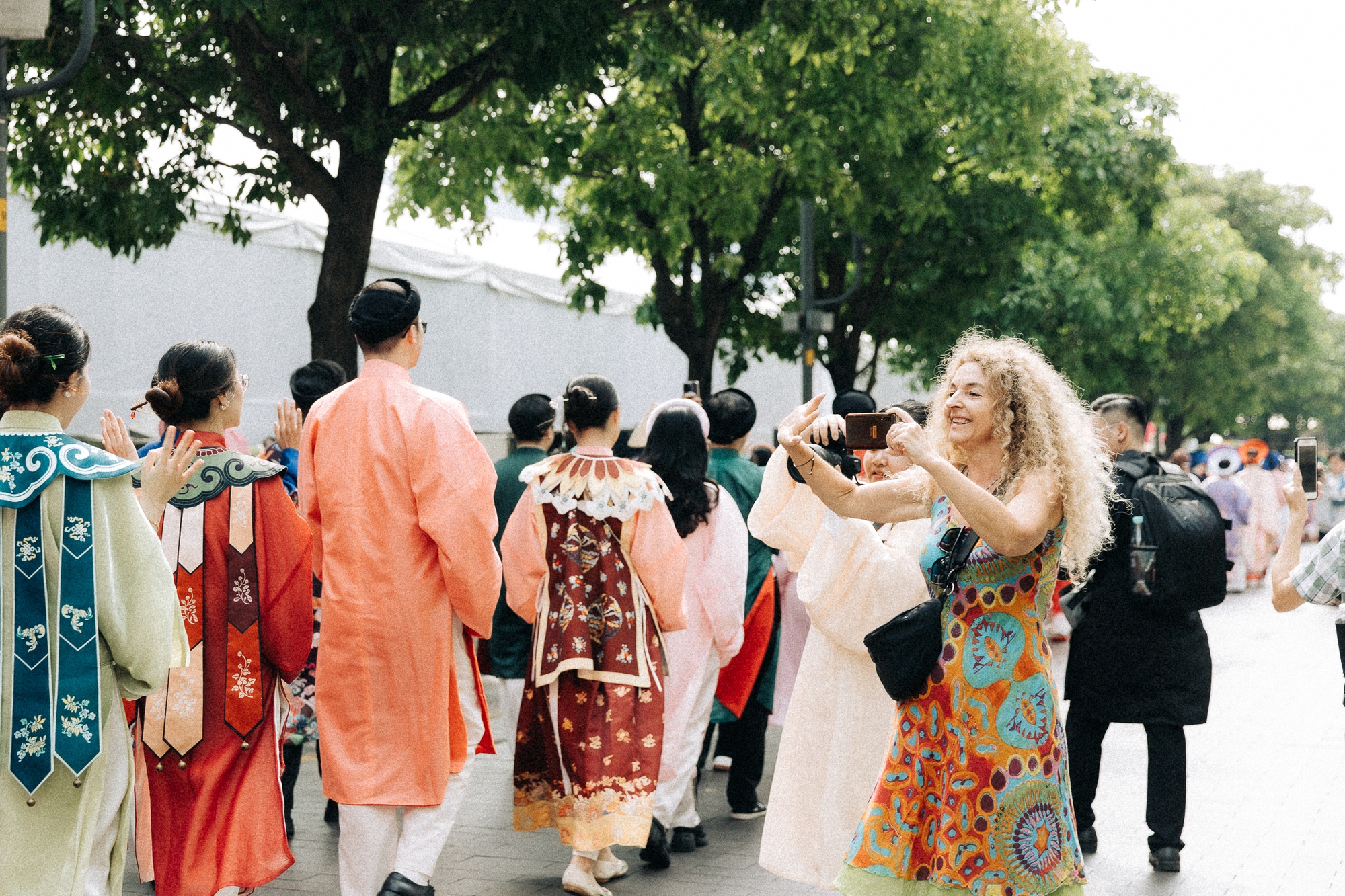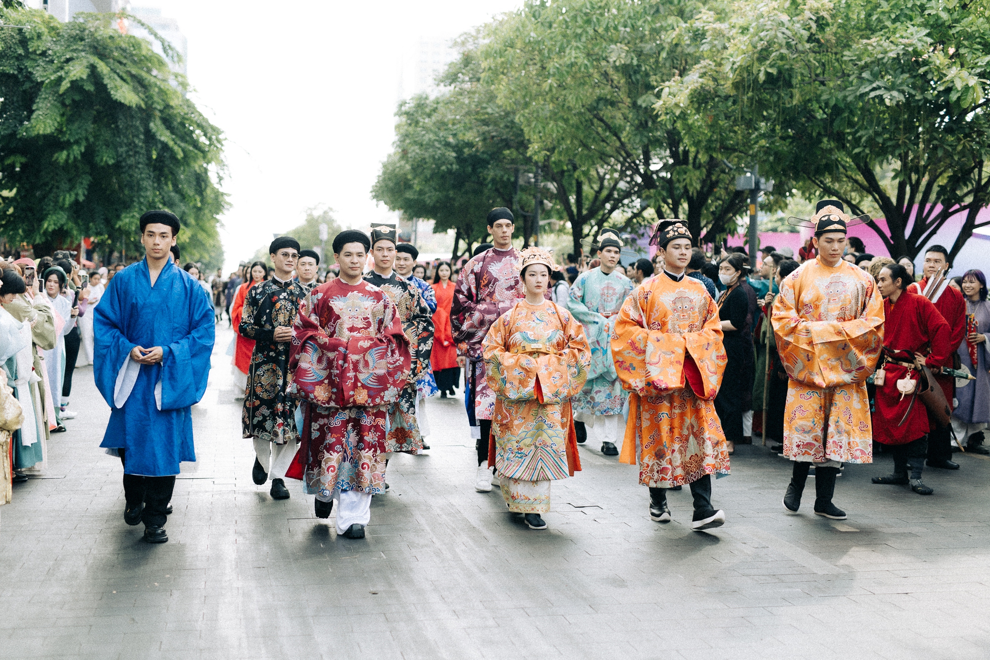 Du khách nước ngoài và người dân địa phương không khỏi bất ngờ và thích thú khi được chứng kiến cảnh tượng hiếm có. Nhiều du khách quốc tế liên tục ghi lại hình ảnh và dành những lời khen ngợi trước vẻ đẹp đầy tinh tế của những bộ trang phục và sự nhiệt huyết của người trẻ tham gia diễu hành.