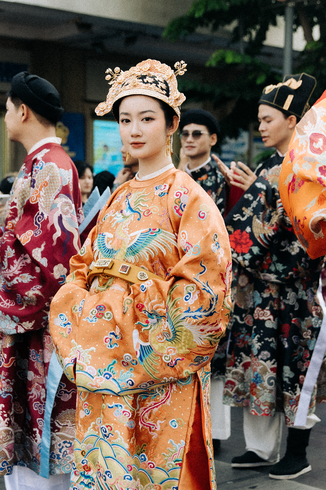 Những bộ cổ phục Việt từ các triều đại như Lý, Trần, Lê, Nguyễn được phục dựng công phu, sống động. Đặc biệt, bộ Phượng bào lộng lẫy với màu vàng quý phái, thêu hình phượng hoàng uy nghiêm, biểu tượng cho sự cao quý của Hoàng hậu thời Nguyễn, thu hút nhiều ánh nhìn ngưỡng mộ.