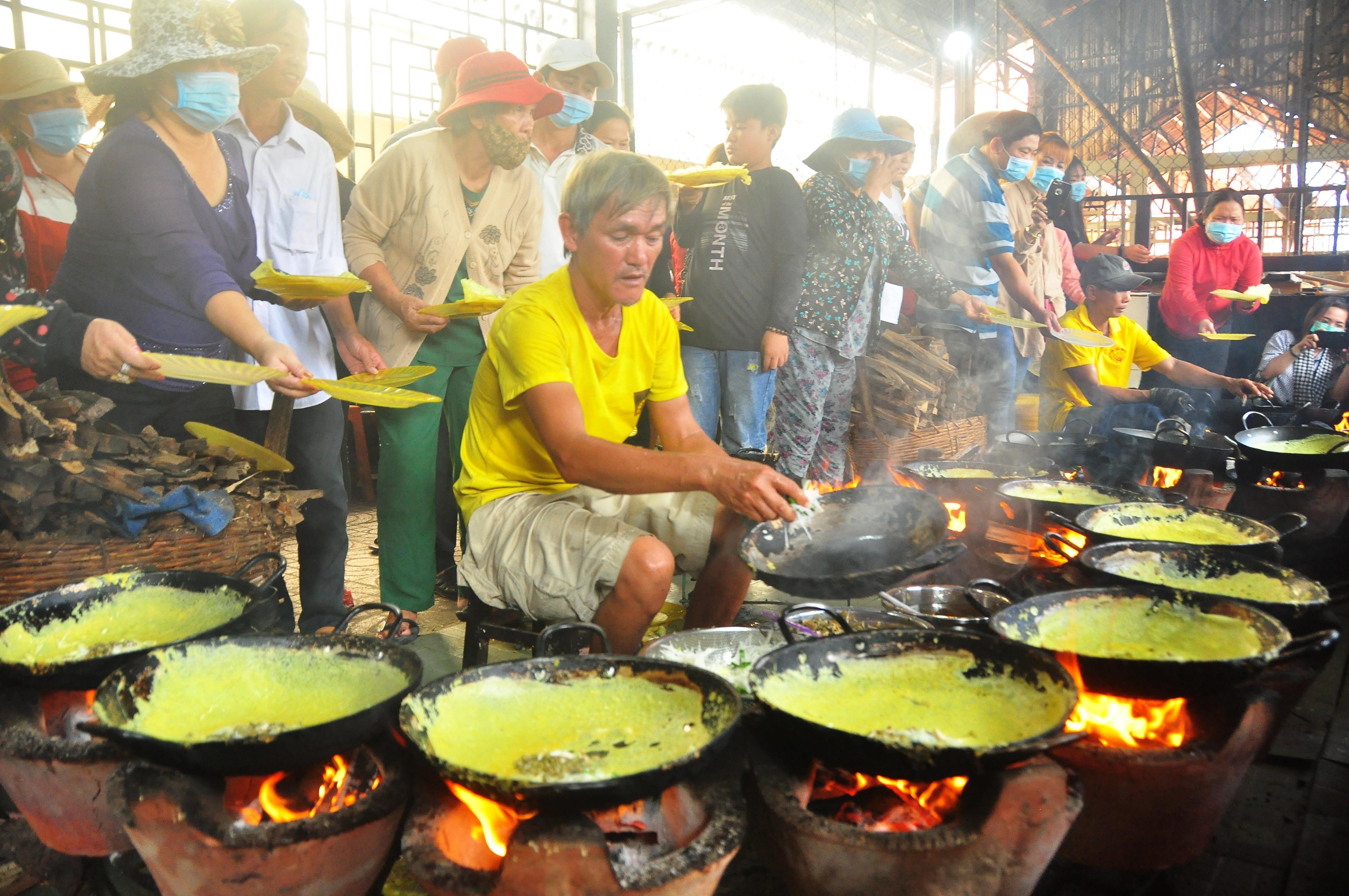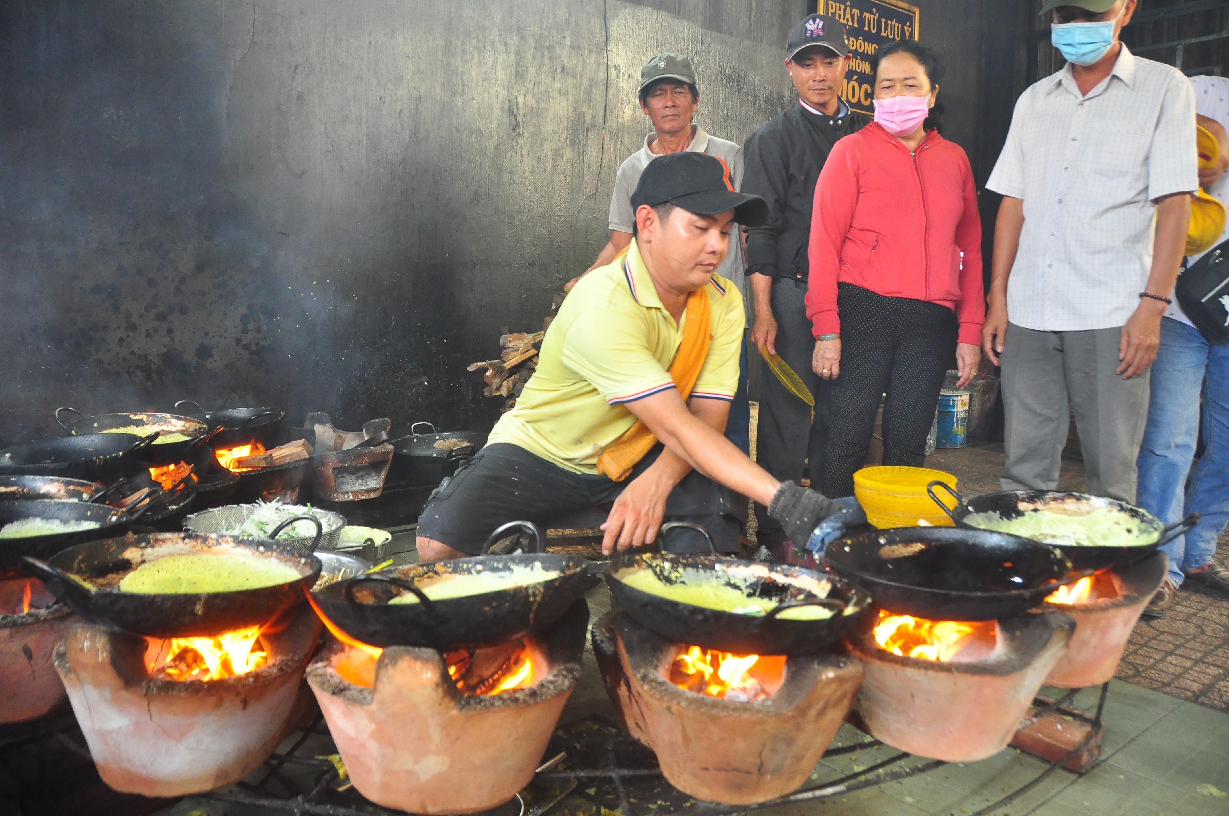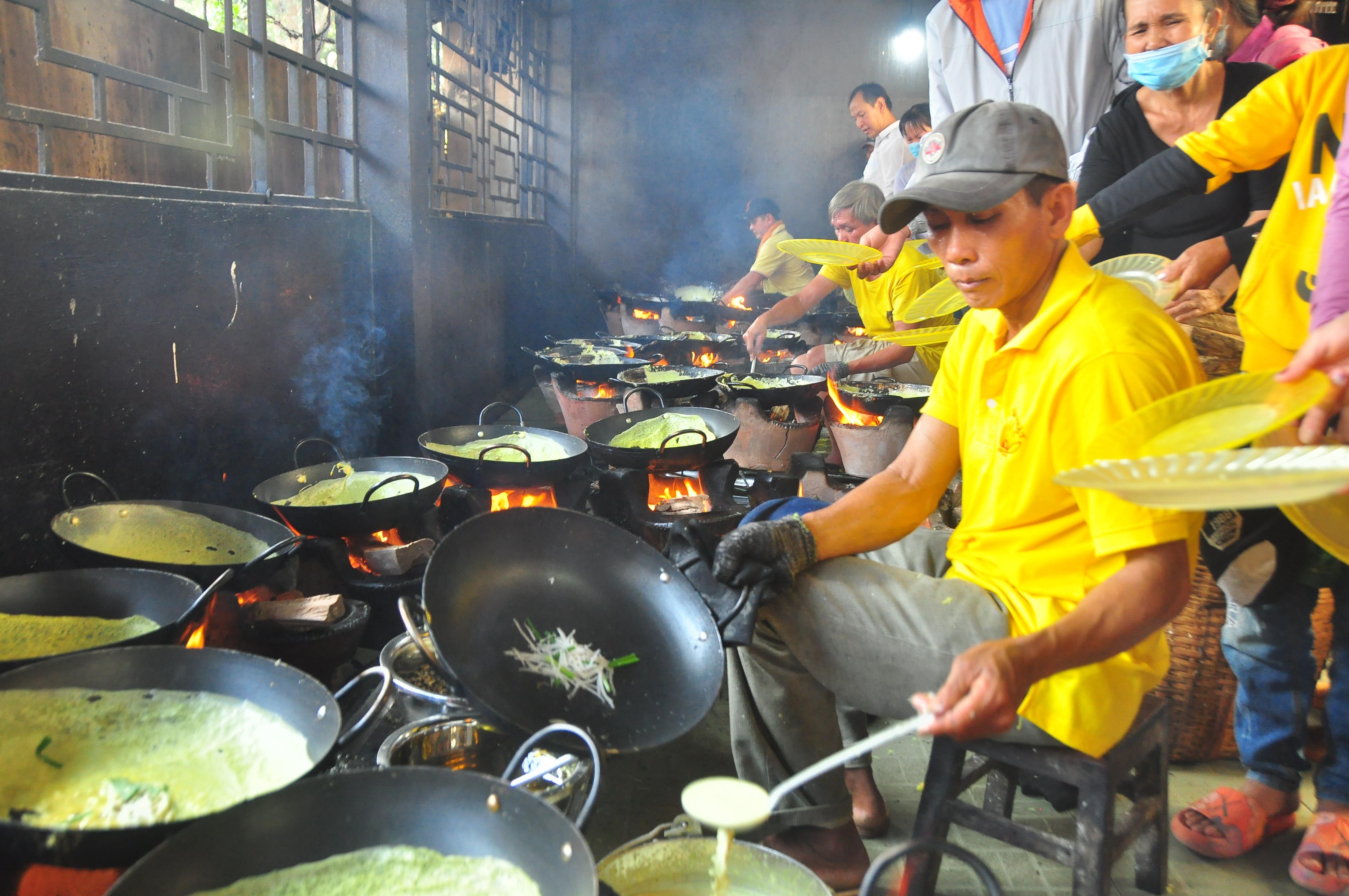 Trong khu bếp của Thiền viện Đông Lai (An Giang) luôn rực lửa, người thợ cùng lúc đổ 10 chảo bánh xèo một cách điêu luyện, thuần thục để phục vụ hàng nghìn phật tử khiến nhiều người cảm thấy mãn nhãn khi chứng kiến.