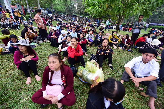 | Người dân ngồi hai bên bãi cỏ chờ đợi đến giờ lên khu di tích thắp hương. Bà Nguyễn Thị Biểu (Thanh Sơn, Phú Thọ) kể nhiều năm nay đều về đền Hùng mỗi dịp 10/3 Âm lịch. "Hàng xóm rủ đi từ mấy ngày trước nhưng tôi đợi đến chính hội mới đi cho có không khí", bà nói và cho biết thấy mừng vì lượng người năm nay không đông bằng năm trước nên có lẽ dễ thở hơn. |