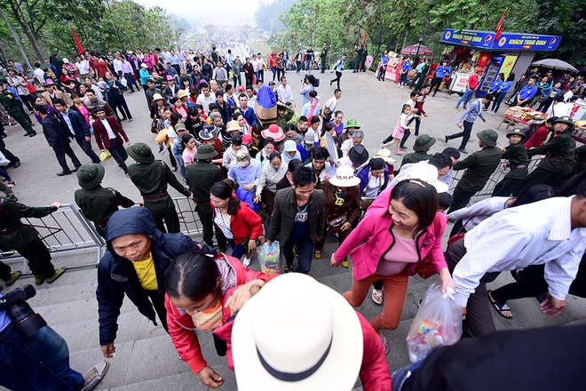 | Dưới chân núi, công an lập hàng rào sống điều tiết dòng người lên đền theo hai hướng: từ sân lễ hội lên và từ ngã 5 đền Giếng lại... |