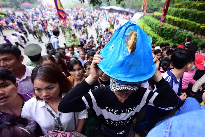 | Người dân chuẩn bị mâm lễ mặn từ sớm để dâng hương. Khi dòng người di chuyển, ban tổ chức liên tục dùng loa thông báo tình trạng đông đúc ở các đền, nhắc nhở không chen lấn, xô đẩy, cẩn thận bị kẻ gian móc túi. |