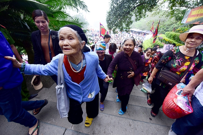 | Nhiều cụ già háo hức bám tay con cháu leo lên khu di tích. |