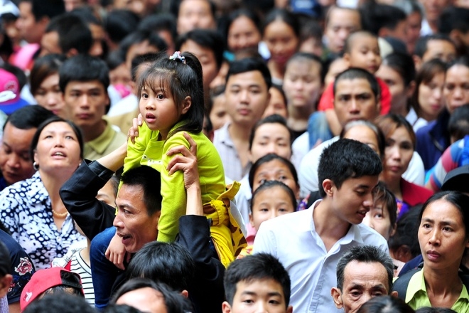| Một số gia đình có con nhỏ phải đội trẻ lên cao để lấy không khí thoáng, tránh cảnh ngộp thở từng xảy ra trong mùa lễ hội trước. |