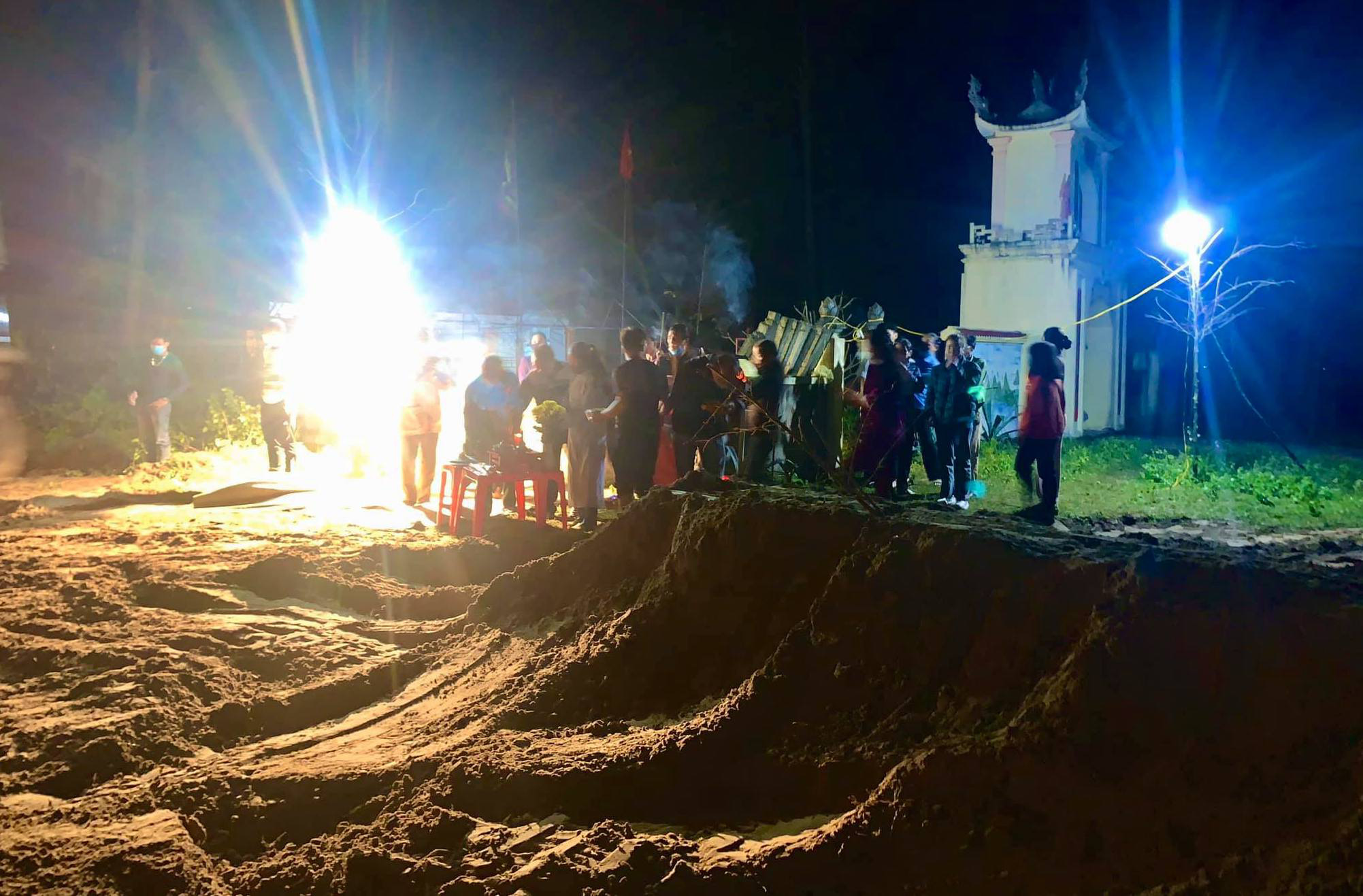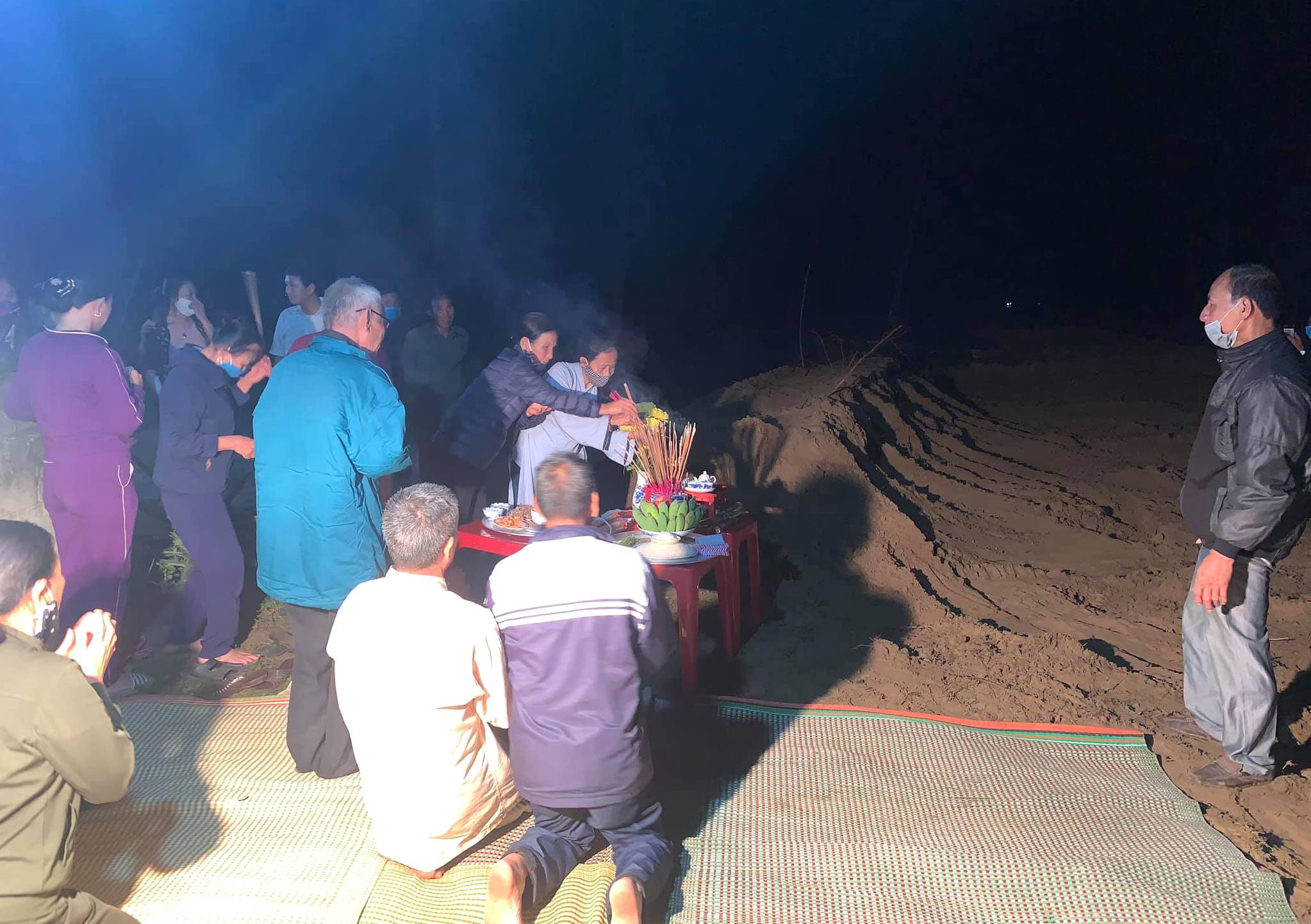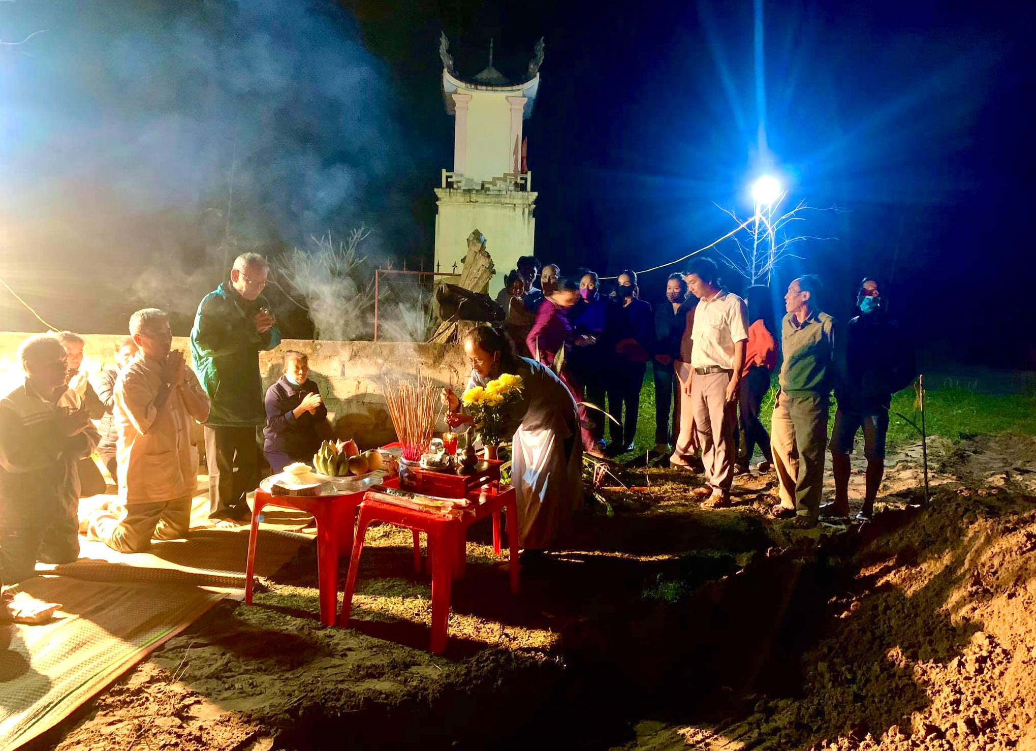Sau khi dùng cẩu kéo xác cá voi nặng hơn 10 tấn đi chôn, người dân đã lập bàn thờ, thắp hương trước phần mộ của cá voi theo tín ngưỡng vùng biển.