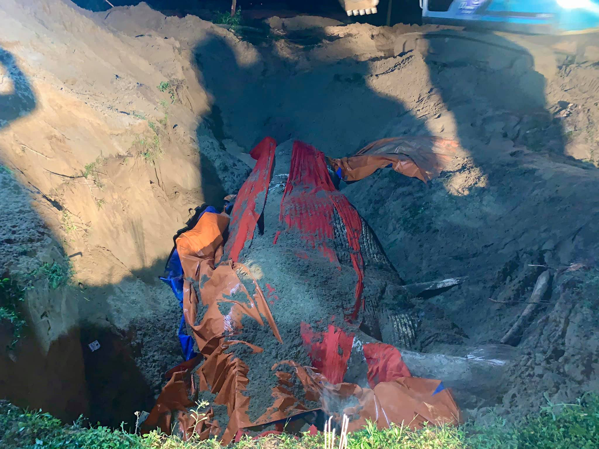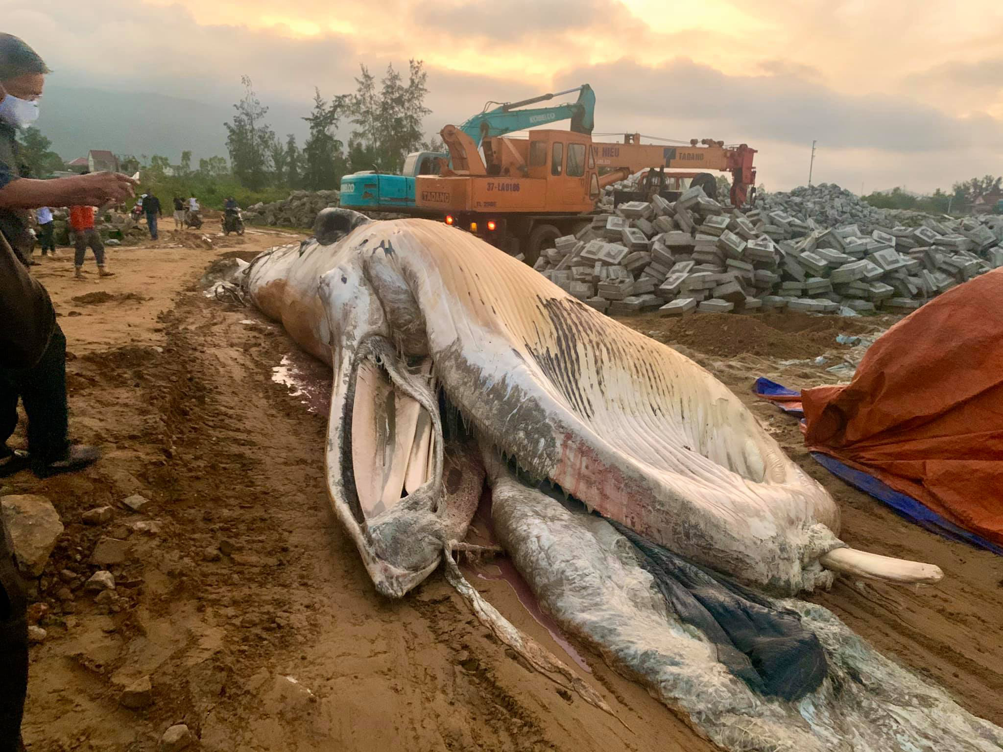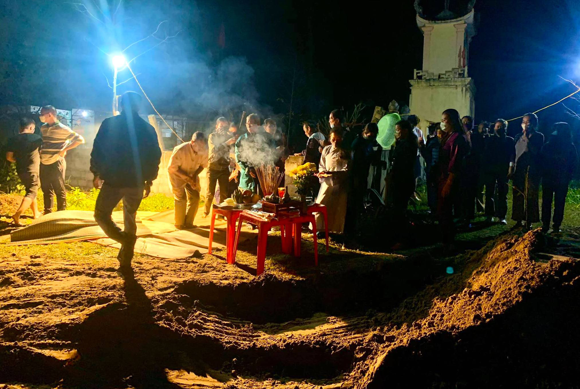 Sau khi dùng cẩu kéo xác cá voi nặng hơn 10 tấn đi chôn, người dân đã lập bàn thờ, thắp hương trước phần mộ của cá voi theo tín ngưỡng vùng biển.