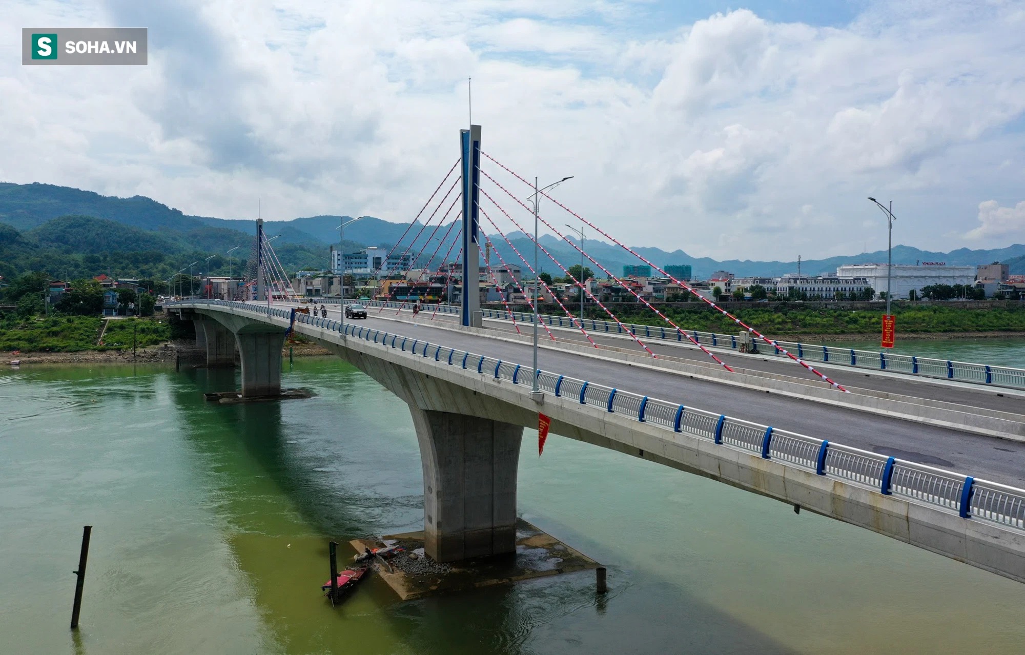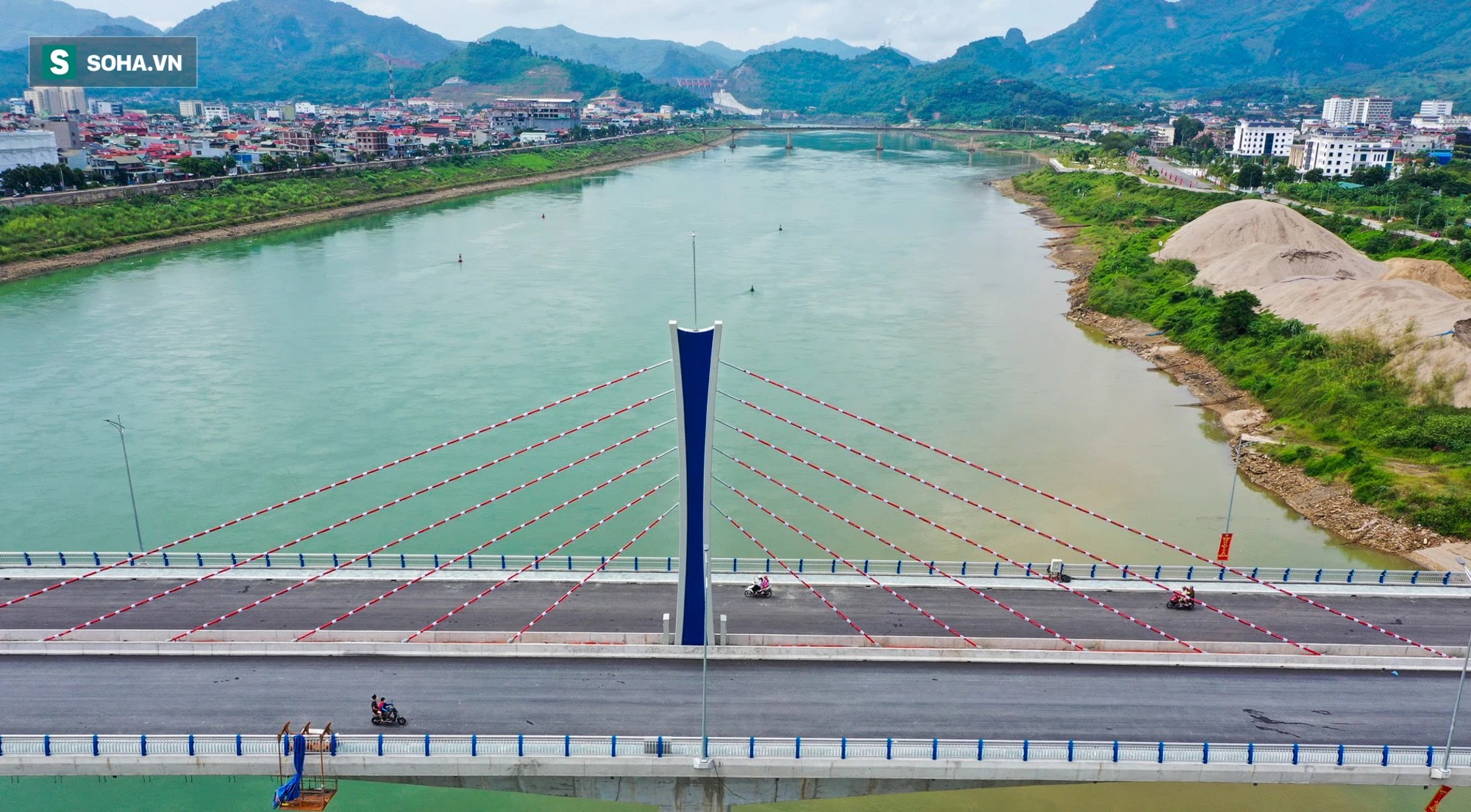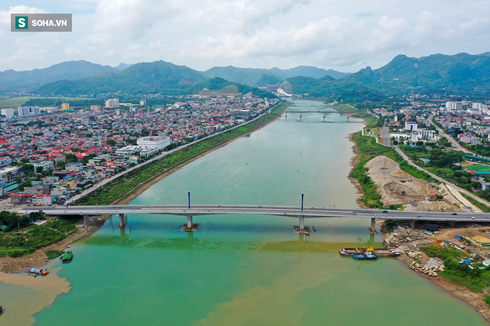 | Toàn cảnh cầu Hoà Bình 2 trị giá gần 600 tỷ bắc qua sông Đà đã được thông xe. |