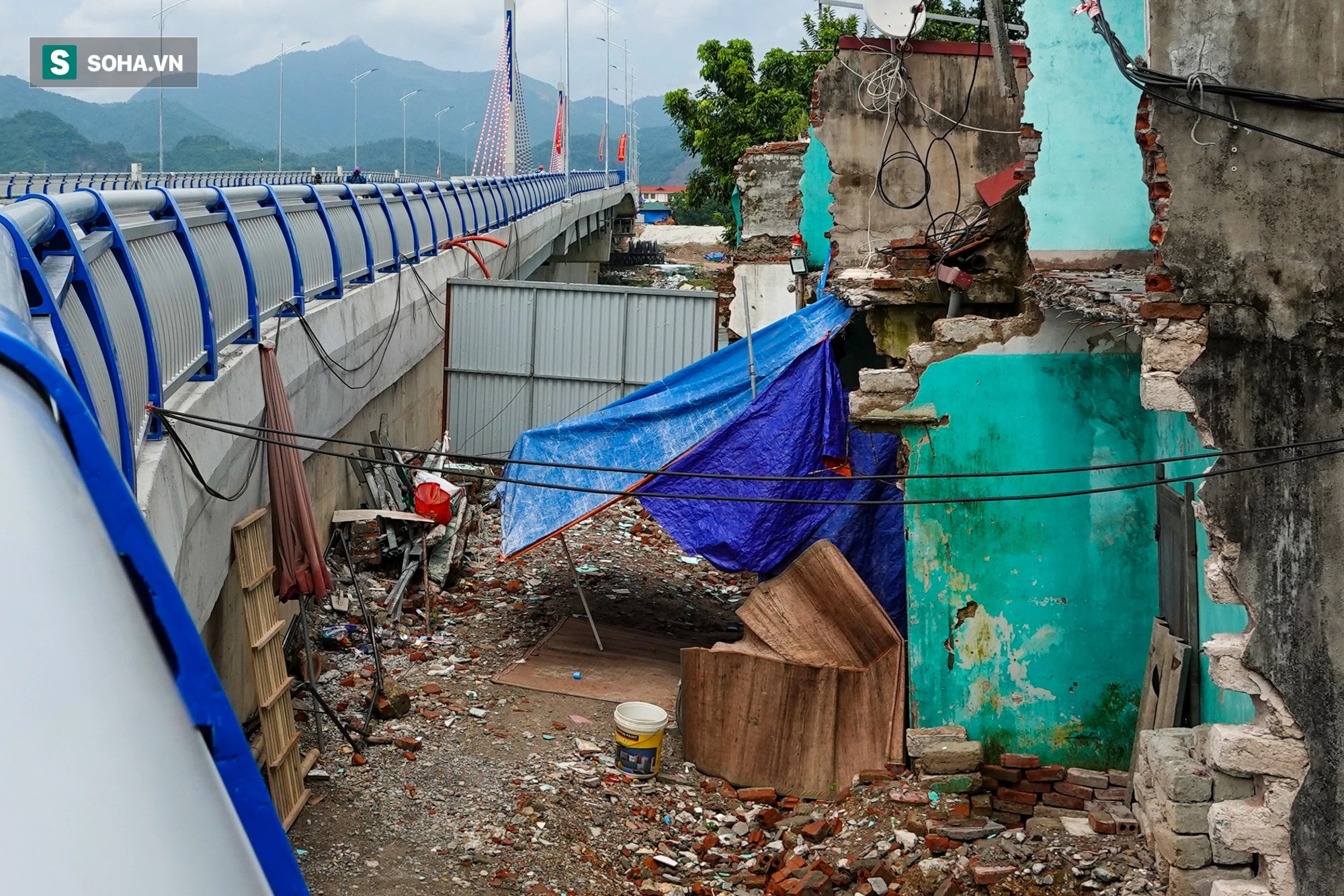 Việc giải phóng mặt bằng vẫn chưa hoàn thiện. Công nhân đang giải tỏa một số nhà dân ở đầu cầu để làm nút giao mở rộng đường.