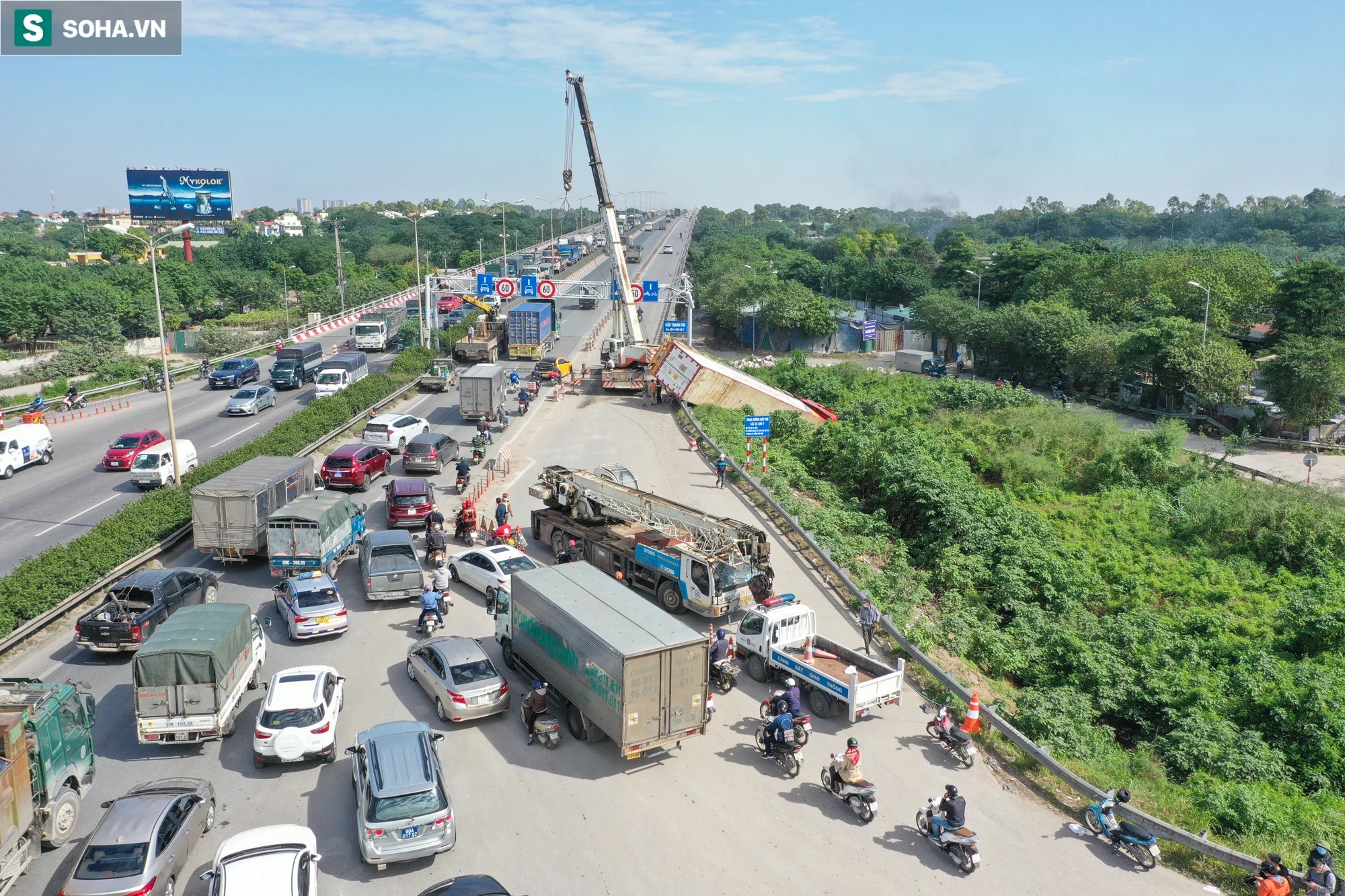 | Lật xe container trên cầu Thanh Trì, ùn tắc kéo dài |