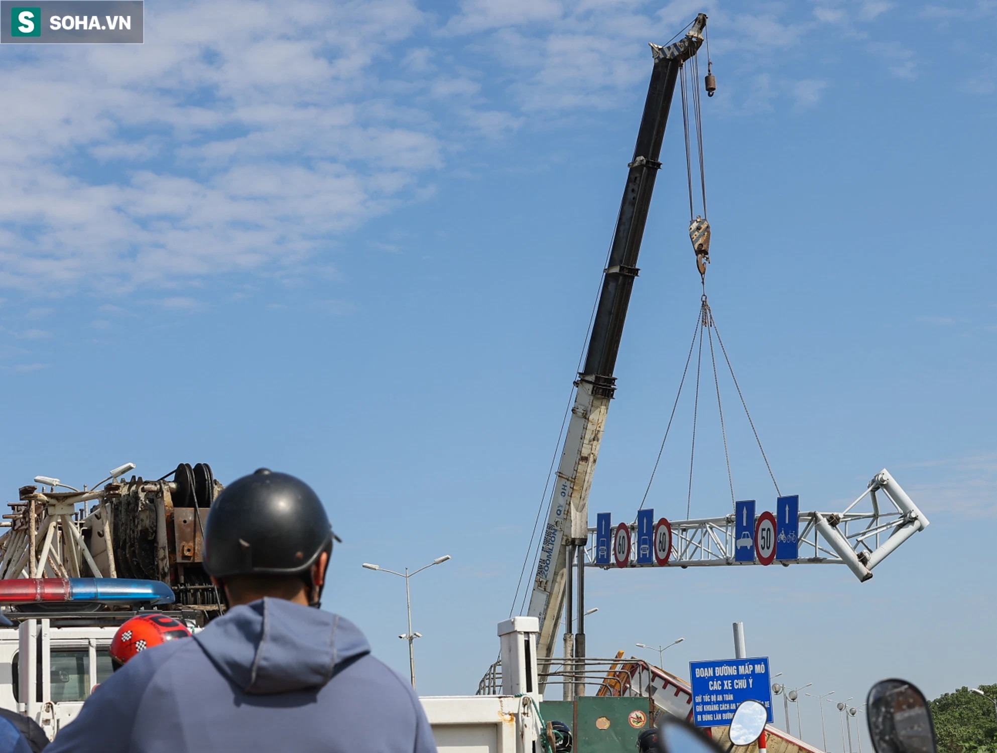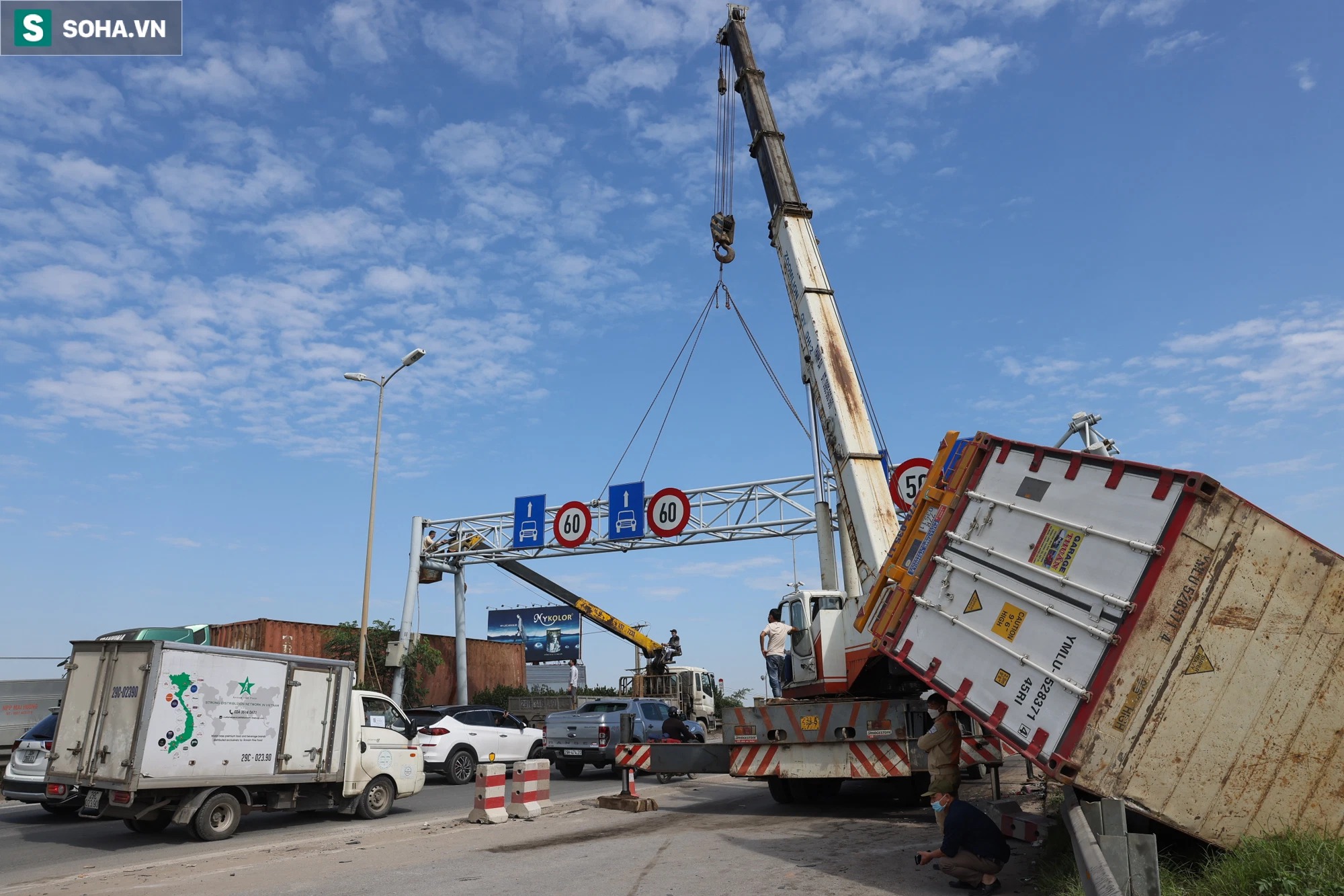 Phần biển báo trước cầu Thanh Trì bị chiếc xe container đè trúng gây hư hỏng, trong trưa nay xe cẩu mới tiến hành di dời phần này.