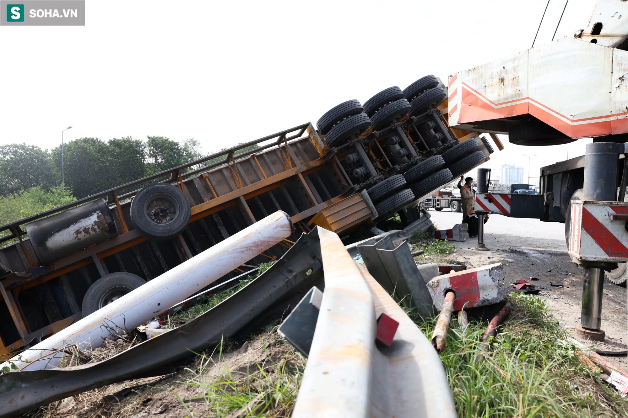 2h sáng nay (9/11) xe container BKS 77H-016xxx kéo theo rơmóoc BKS 77R-035xxx lưu thông trên đường vành đai 3 trên cao hướng quận Hoàng Mai đi huyện Gia Lâm khi đến đoạn lên cầu Thanh Trì thì tự lật.