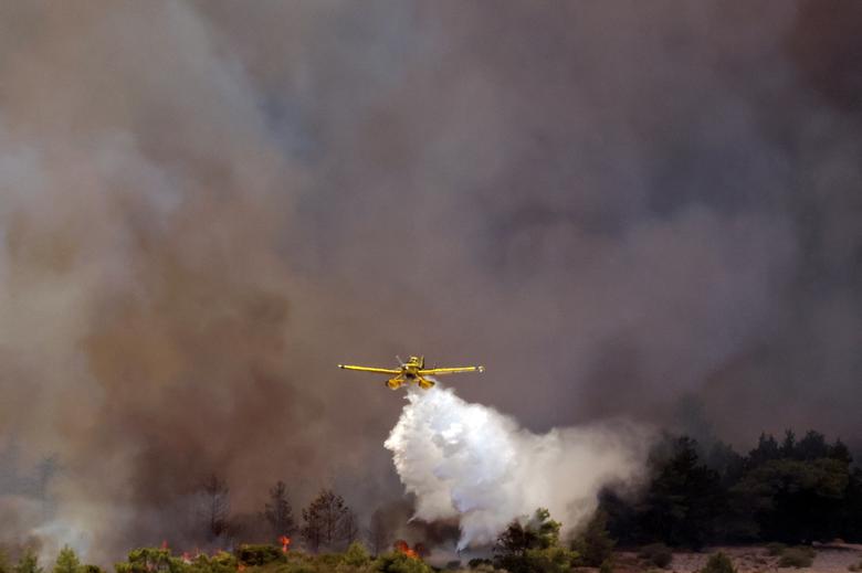 Máy bay chữa cháy thả nước xuống khi đám cháy rừng bùng phát gần làng Asklipieio, trên đảo Rhodes, Hy Lạp, ngày 26/7
